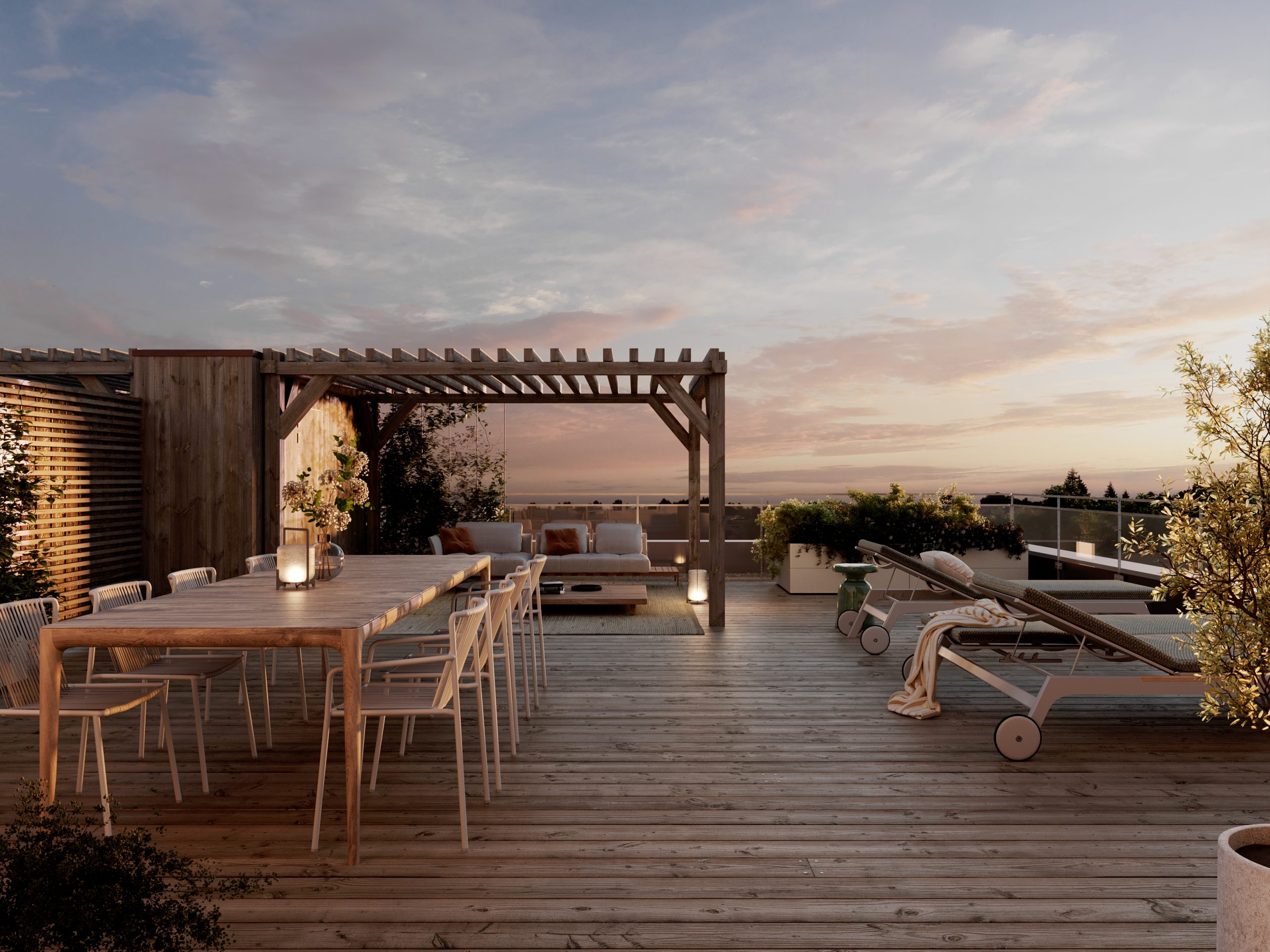 Flere bygg får også fellesterrasser på taket, med ulike soner for opphold, vegetasjon, langbord og pergola. Noen av boenhetene får tilgang til egen parsellhage på taket, og alle takhager har ideell beliggenhet med tanke på sol og utsikt.