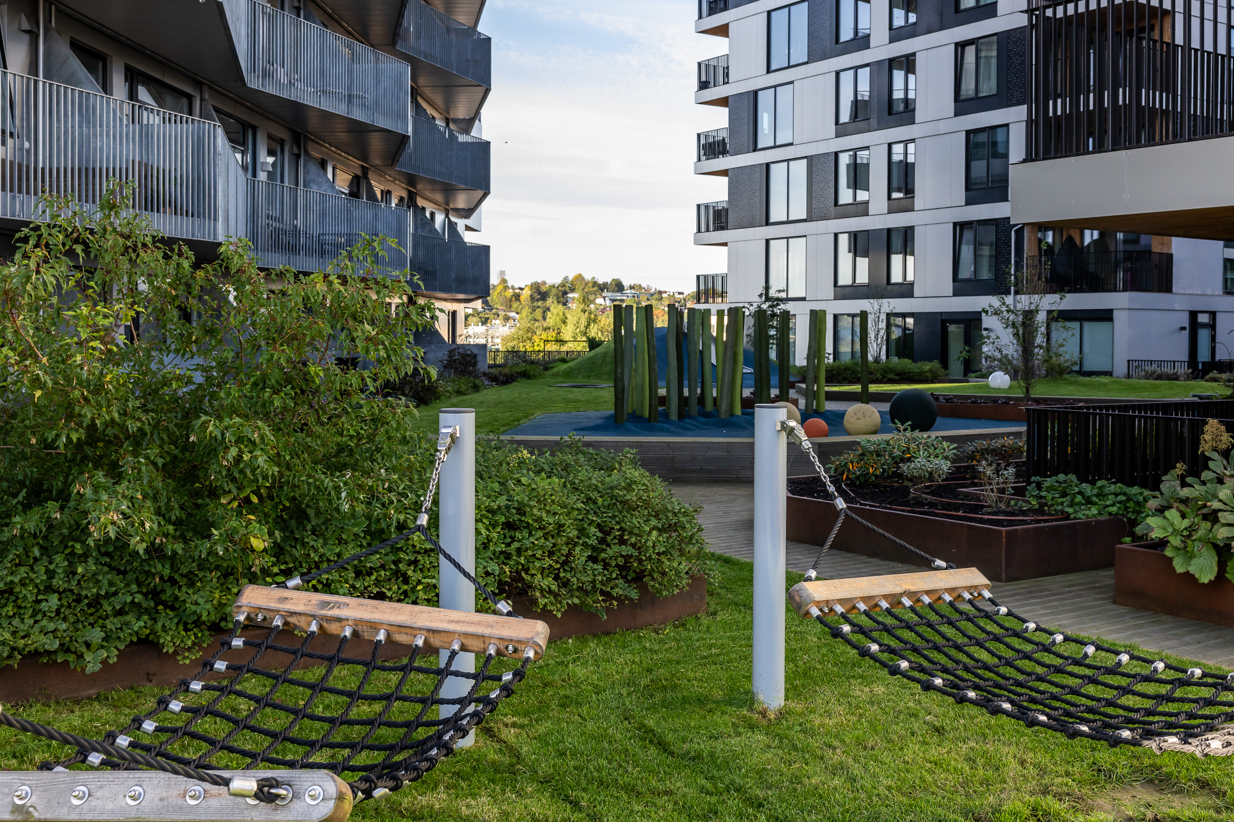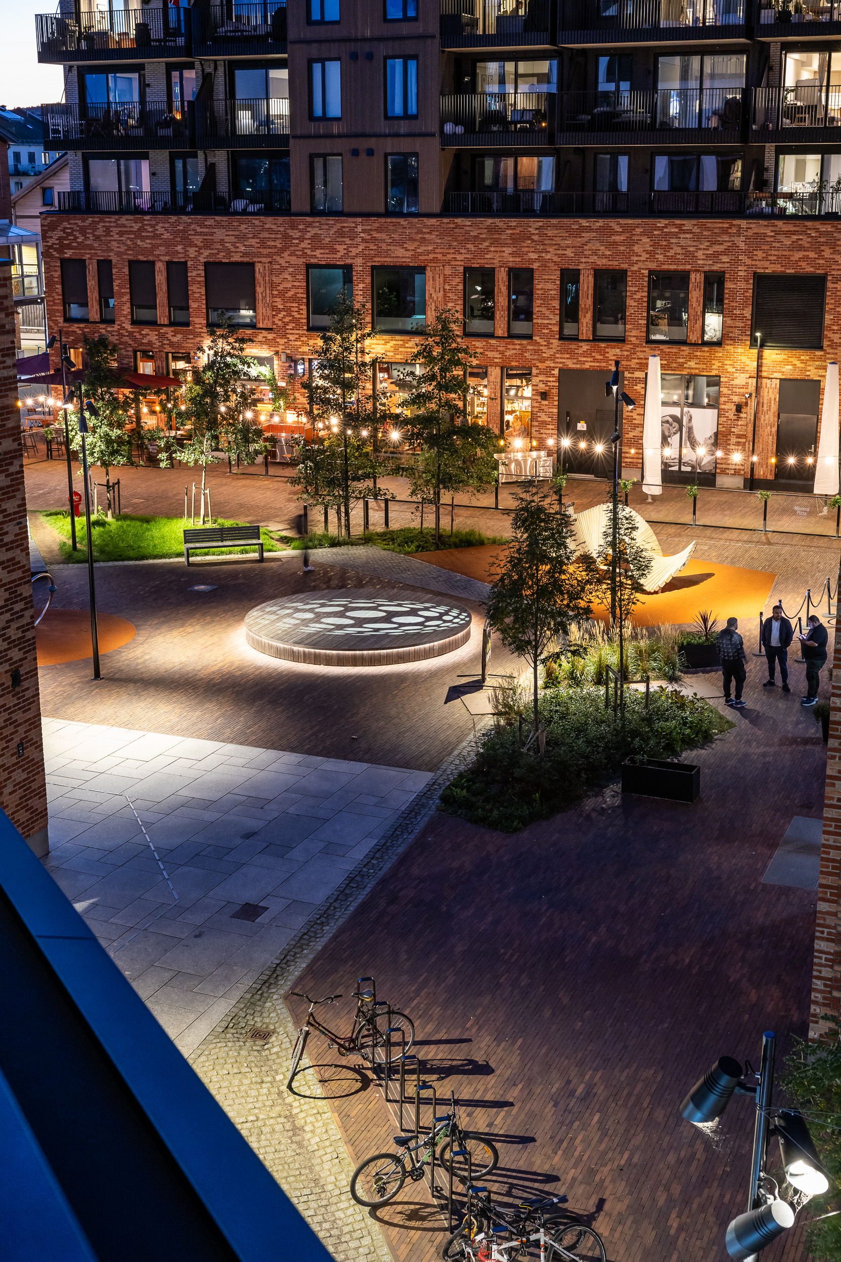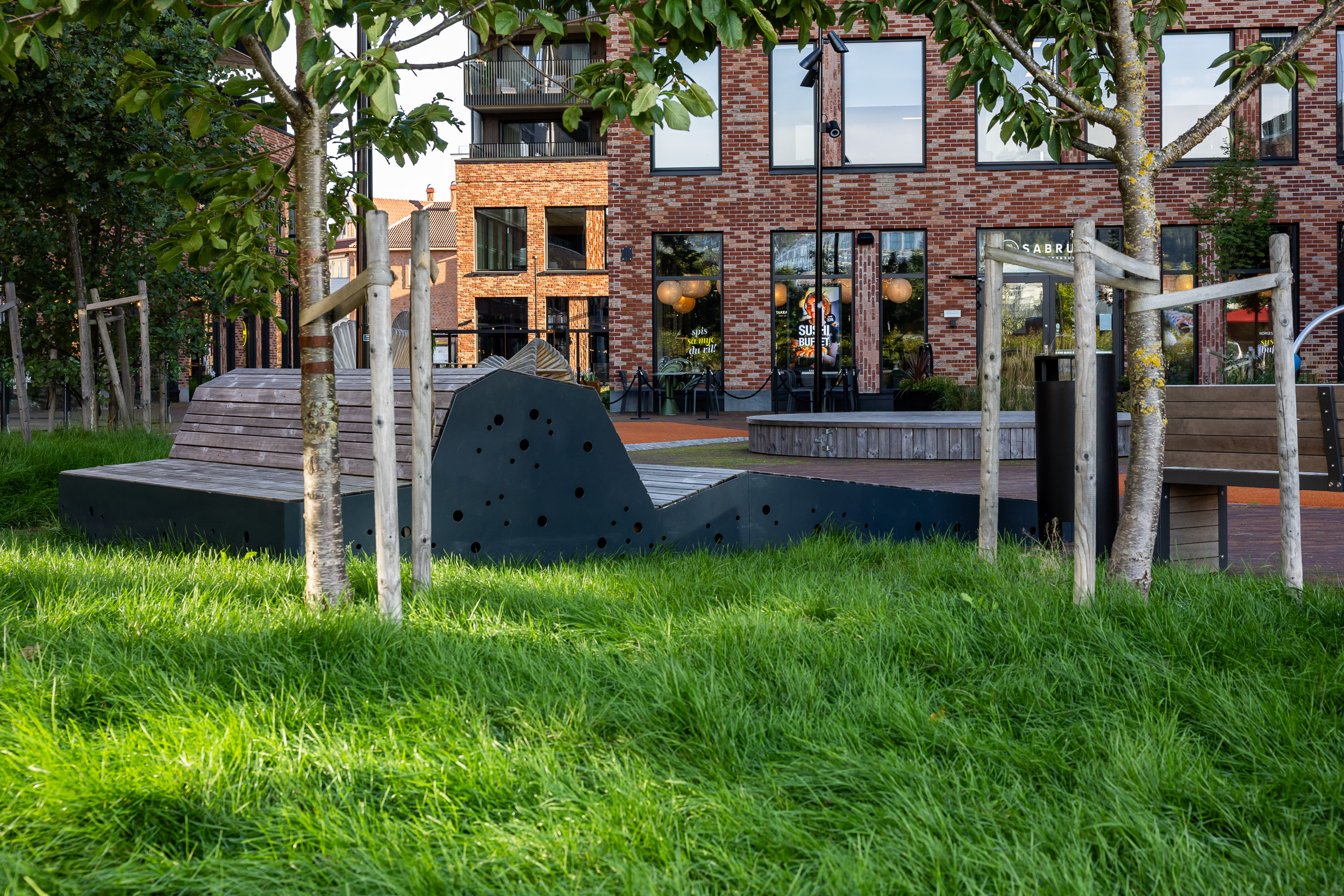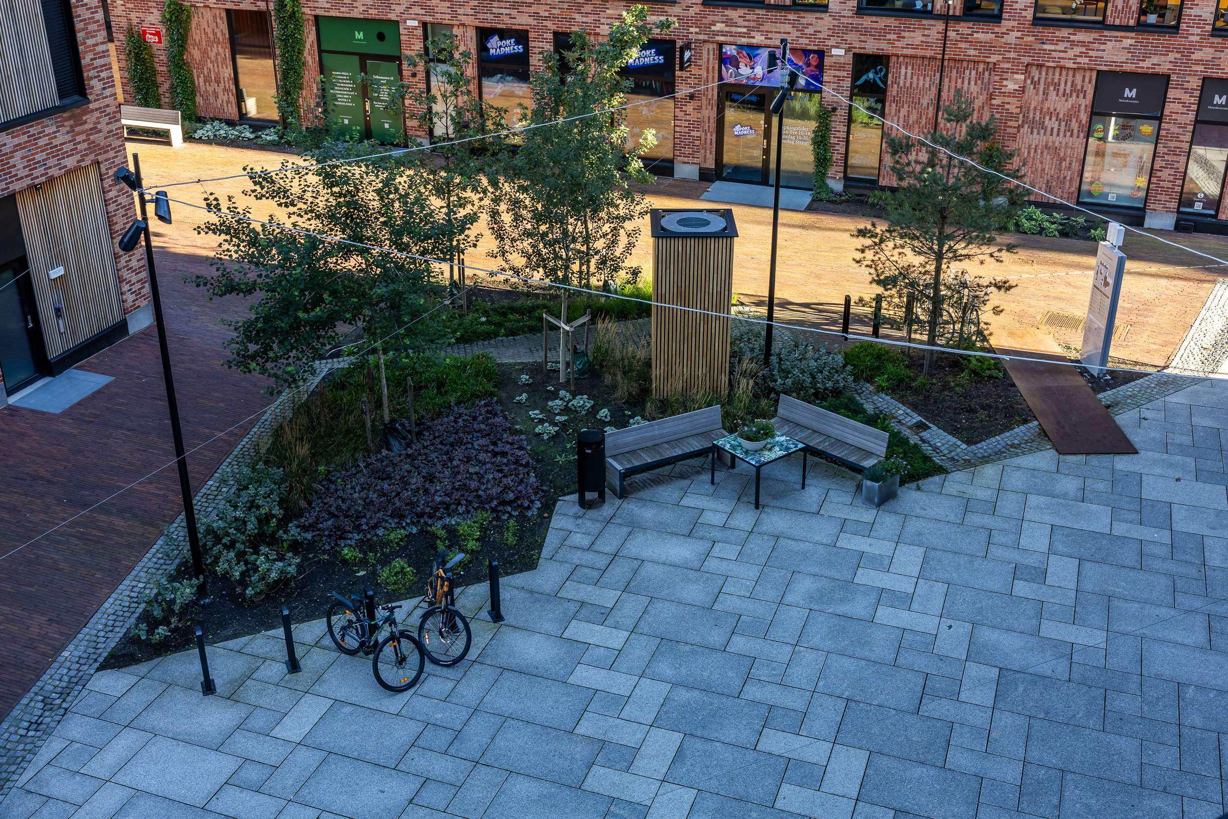 Kvartalet er bilfritt og utformet som et trygt og attraktivt samlingssted for barn og voksne i nærmiljøet – et sted som stimulerer til aktivitet, kreativitet og sosialt fellesskap.