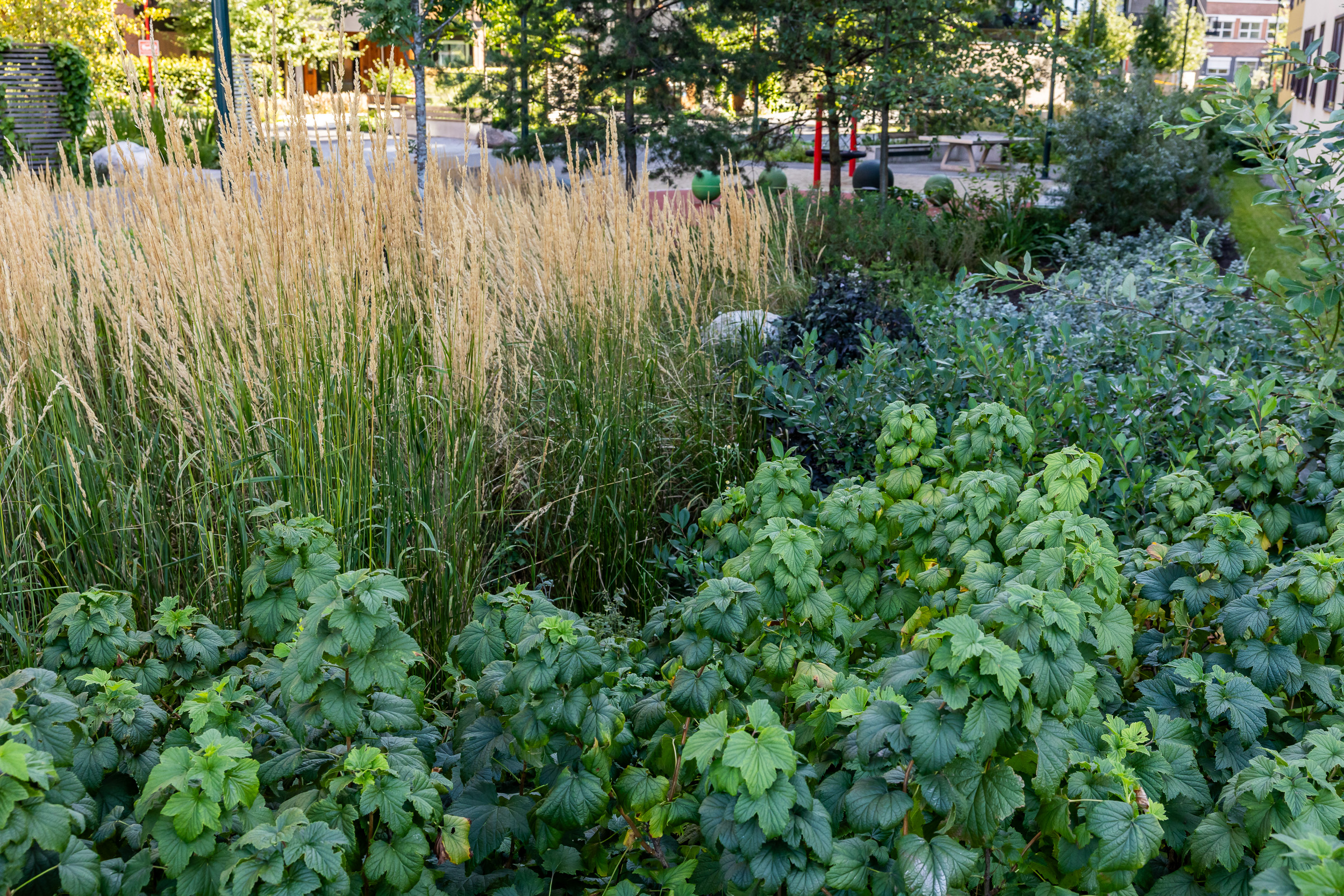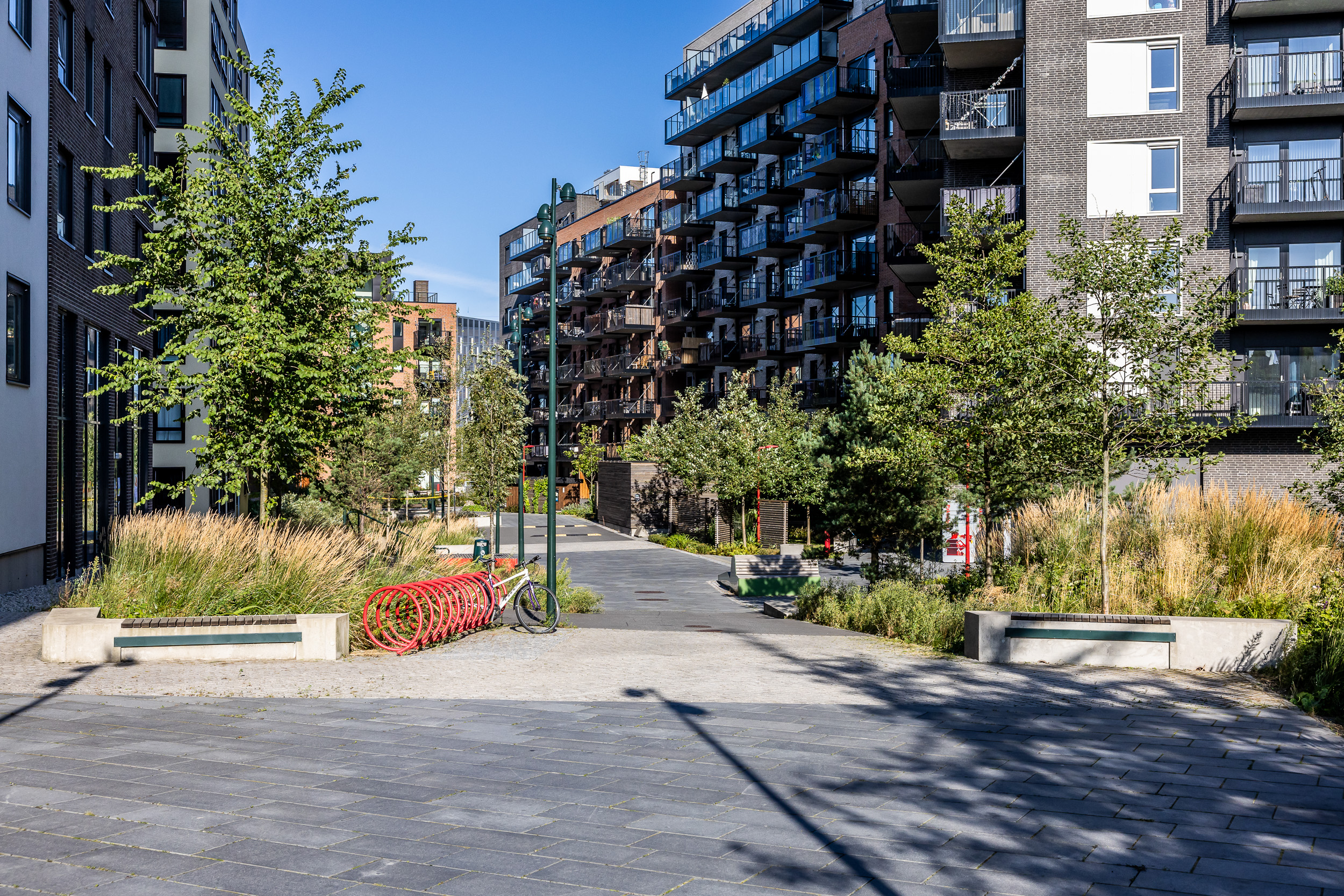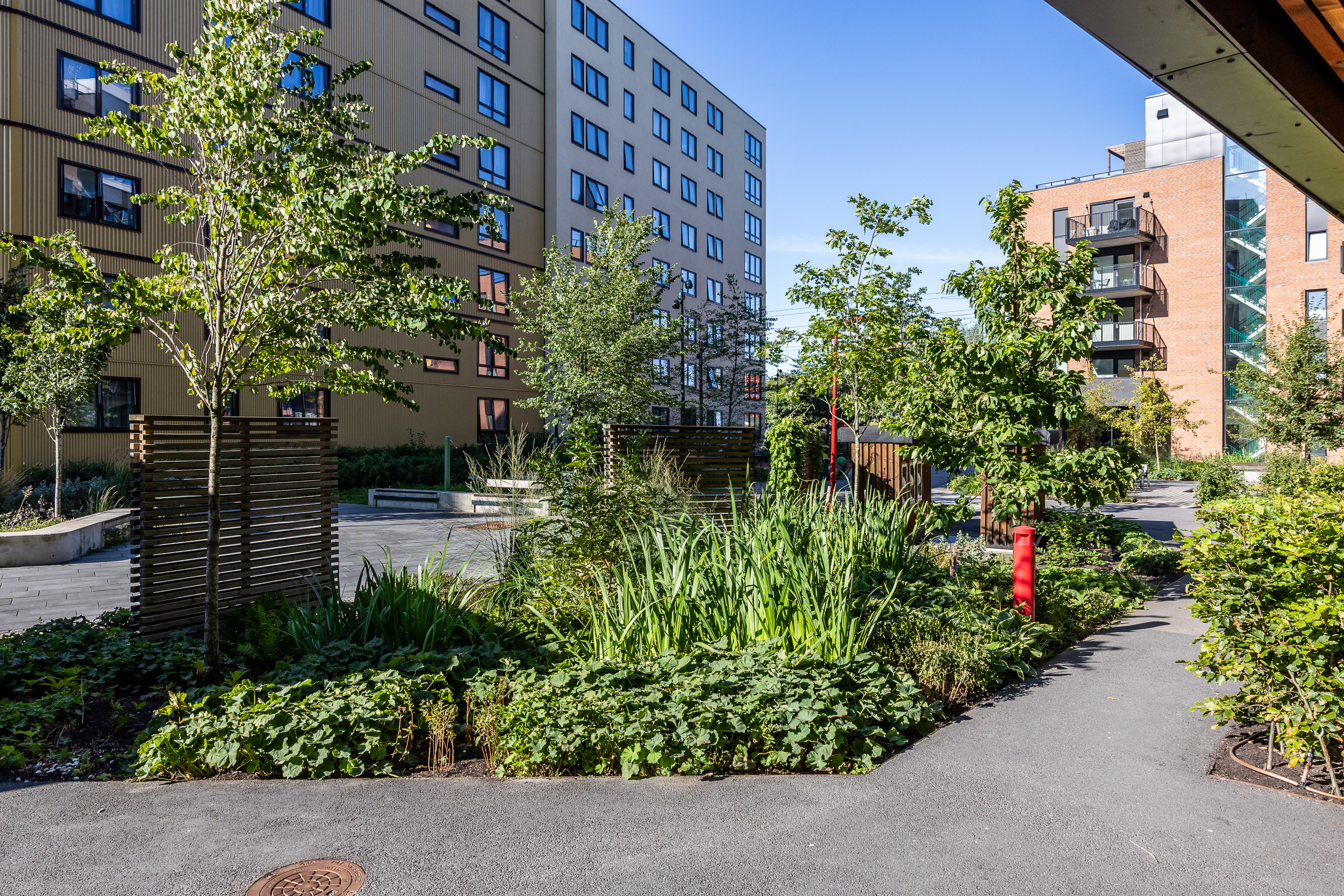 Da byggingen startet, var området uten insekter. Fire år senere summer det av liv i de frodige regnbedene – et levende bevis på hvordan god landskapsutforming kan bidra til økt biologisk mangfold midt i byen.