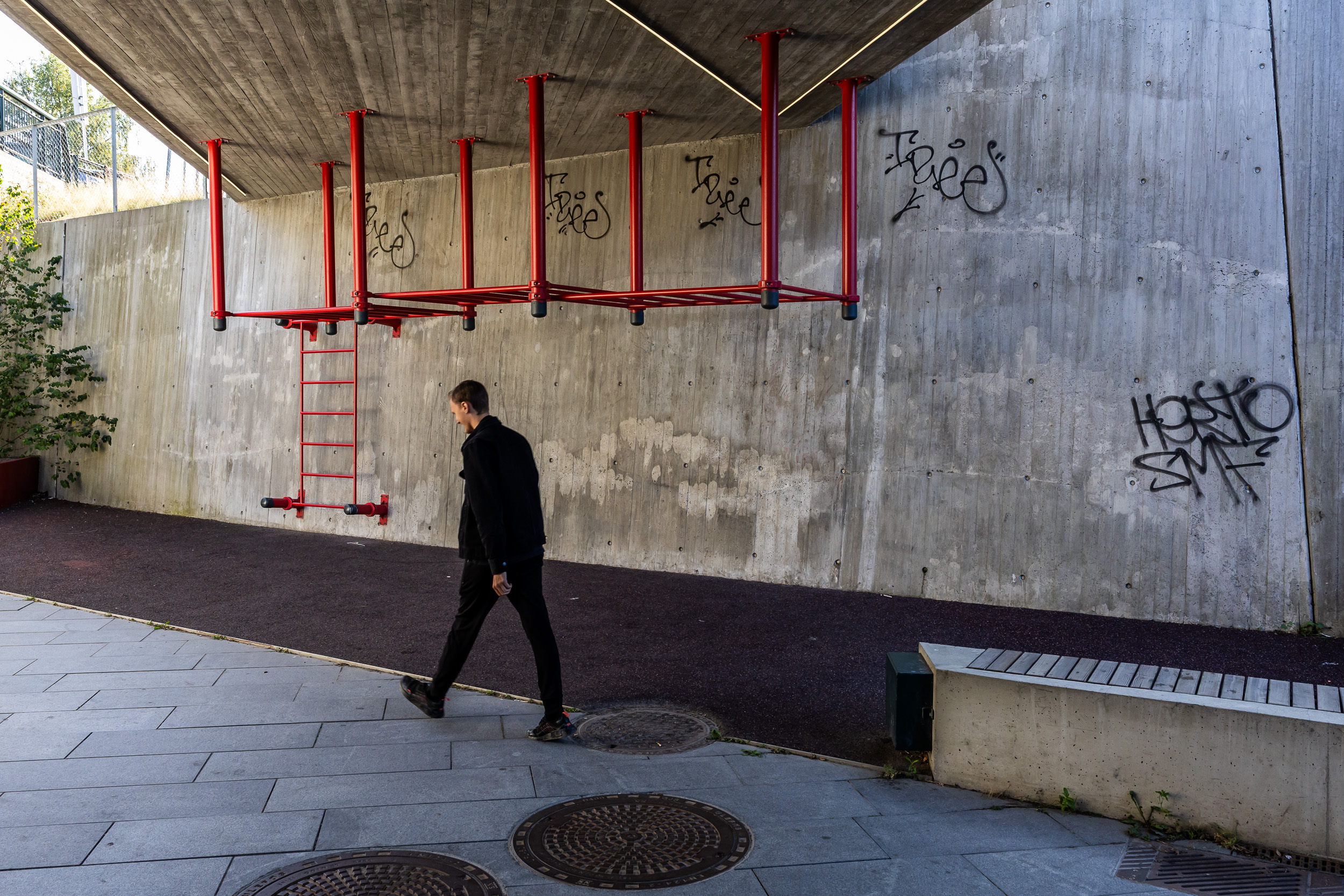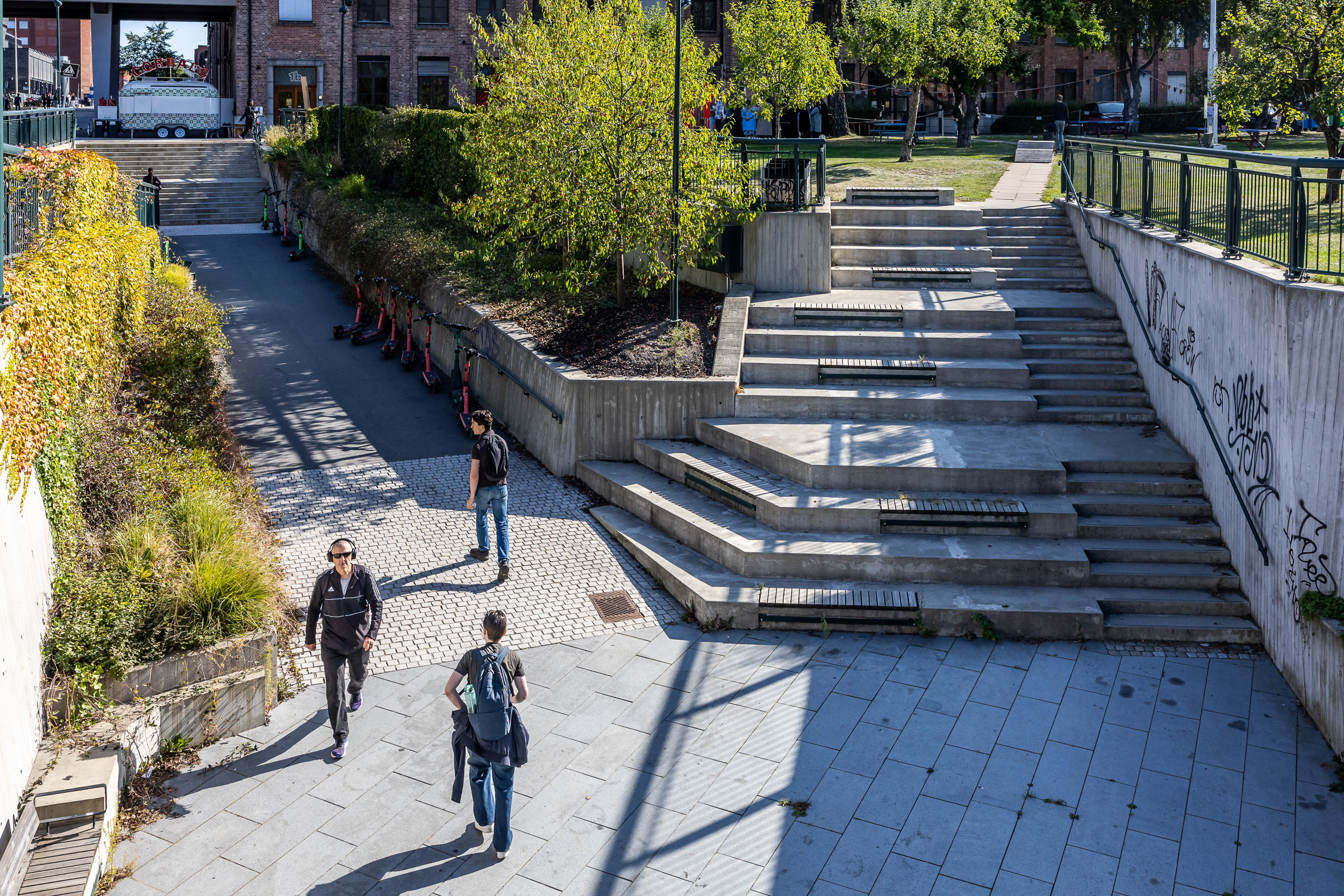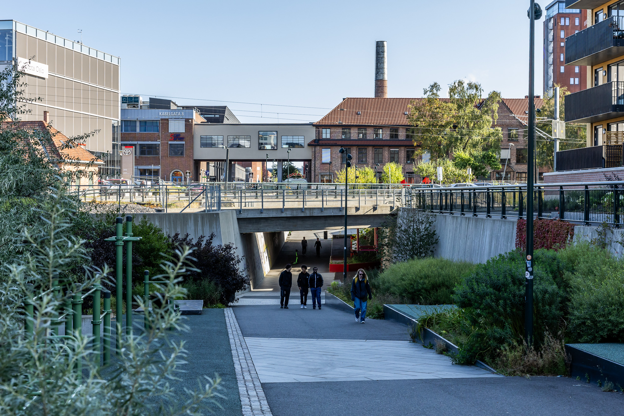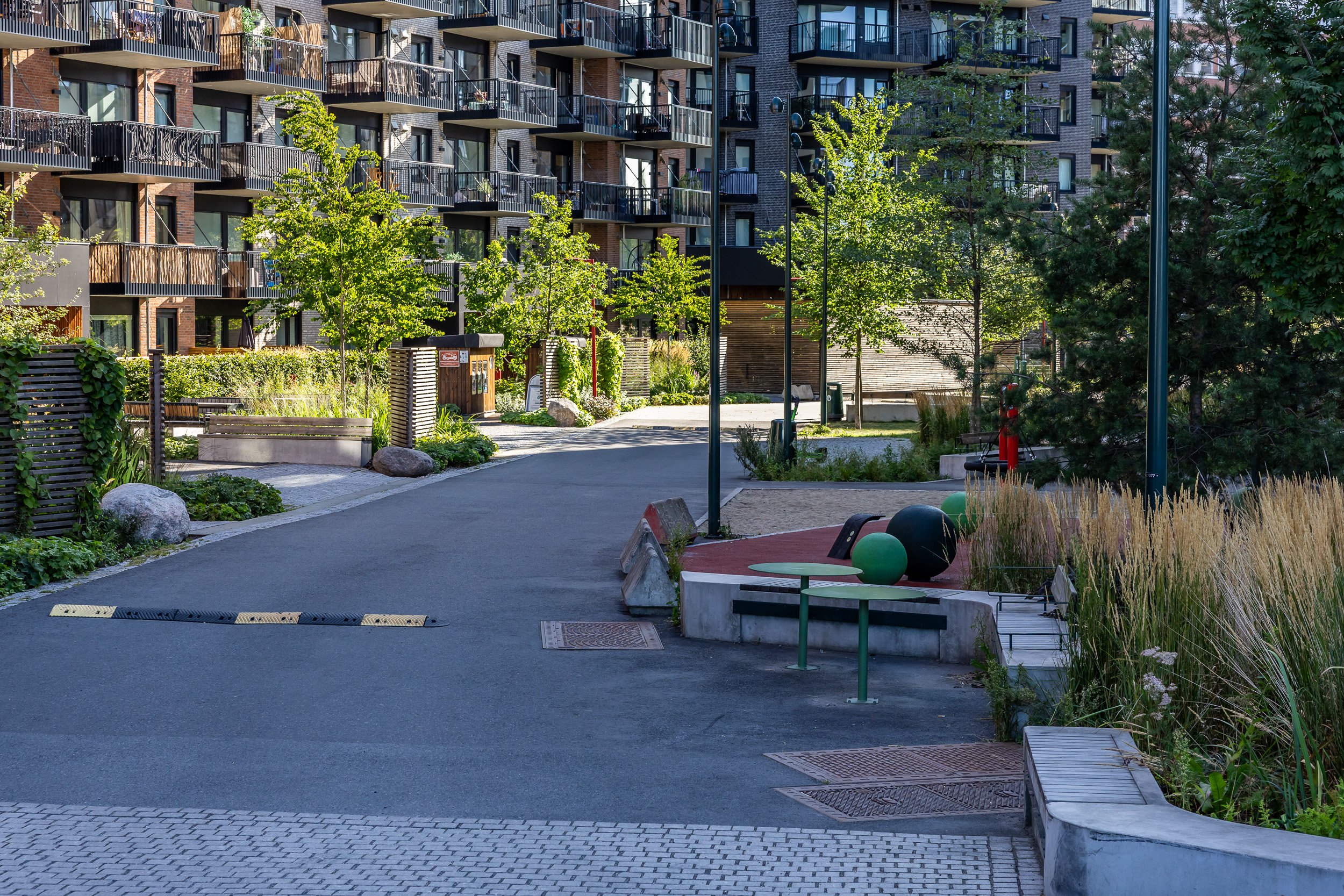 Gatetunene representerer det grønne skiftet. De er frodige, bilfrie og lagt til rette for opphold, lek og møte mellom mennesker. Gateløpet er strukturert med tverrgående linjer som understreker at dette er et oppholdsrom – ikke en ferdselsåre for biler.